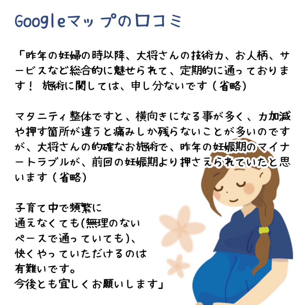 グーグルに頂いた口コミ 産後の骨盤調整で伺いました。座った状態からうまく立ち上がれなかったり、歩く時の違和感がありましたが、改善されました。産前の状態に戻り、調子もよくなりました。