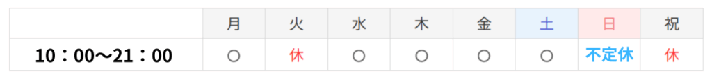休診日/火曜・祝日 ※日曜は不定休です、このページの上の方で確認出来ます(月に2回は営業します)