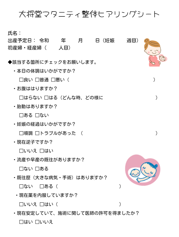 妊娠中には避けた方が良いとされるツボは押さないようにしています。また、「何週目か」「胎動の有無」など、妊婦さん専用のヒアリングシートを使って、より丁寧に確認させていただいています。